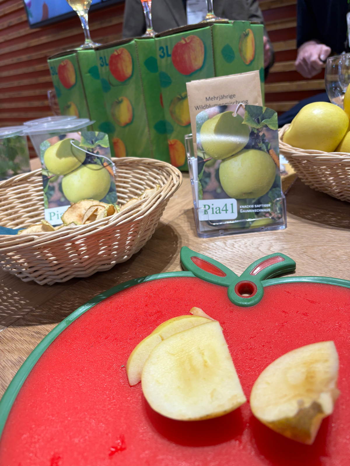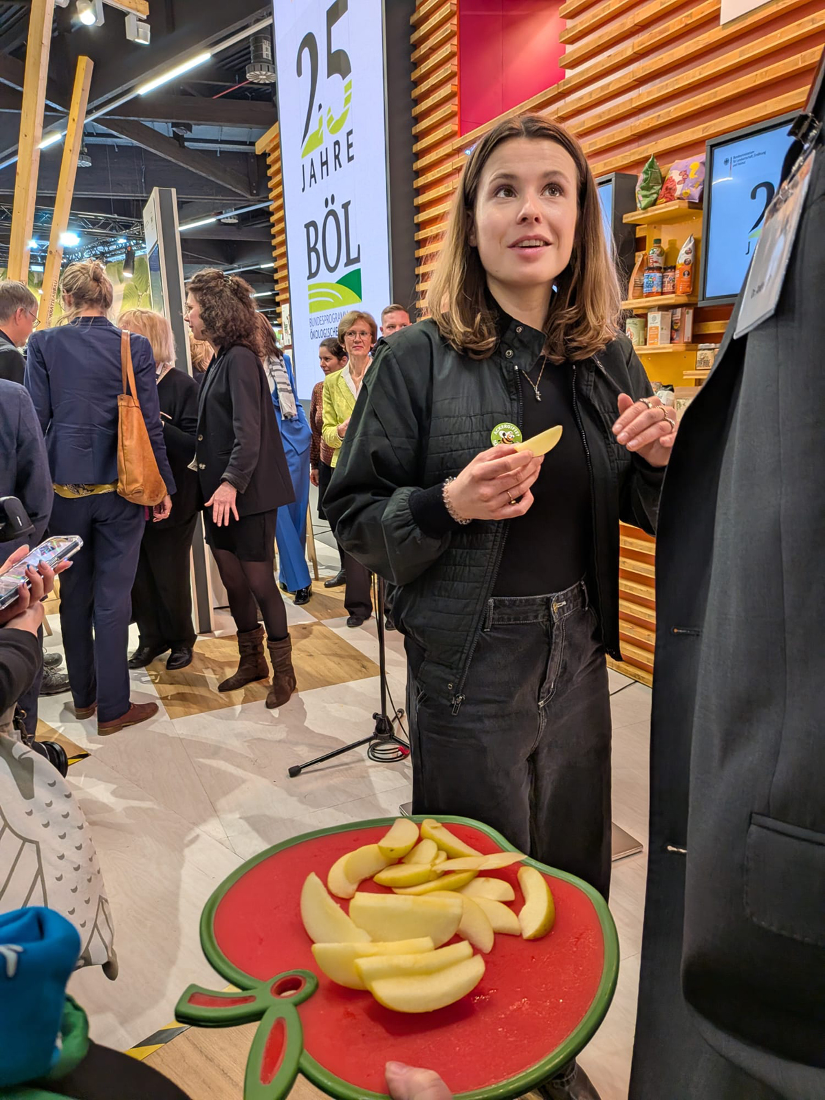 Anlässlich der von der BLE organisierten Feierstunde mit Tortenanschnitt zu 25 Jahren Bundesprogramm Ökologischer Landbau, kurz BÖL, fanden auch viele VIP-Gäste den Weg zum BMLEH-Stand. So probierten u.a. die Vorstandsvorsitzende des Bundes für Ökologische Lebensmittelwirtschaft (BÖLW) Tina Andres, BÖLW-Geschäftsführer Peter Röhrig, Georg Forster der Verbandschef von ECOVIN, dem Bundesverband Ökologischer Weinbau e.V. und auch Eröffnungsrednerin Lisa Neugebauer und Bundeslandwirtschaftsminister Alois Rainer die neue Apfelsorte Pia41.