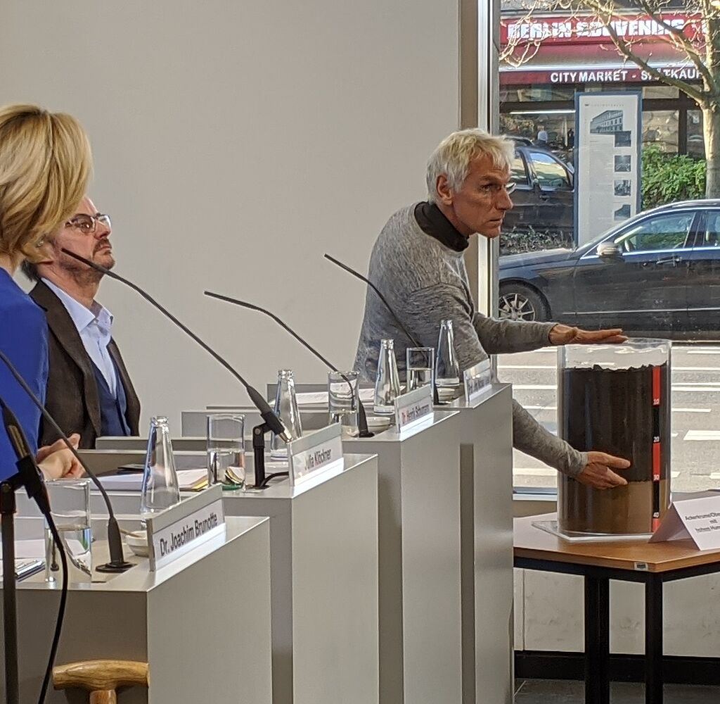 Der Bericht des Expertenteams ist ein Beispiel für die Politikberatung, die Bundesforschungsinstitute wie das Julius Kühn-Institut und das Thünen-Institut leisten. Im Rahmen des Pressetermins zur Vorstellung der Ackerbaustrategie erläuterte der Leiter des JKI-Fachinstituts für Pflanzenbau und Bodenkunde, Prof. Dr. Jörg Michael Greef, den anwesenden Journalistinnen und Journalisten beispielhaft die Maßnahmen zum Humusaufbau und Erosionsschutz (siehe Foto).