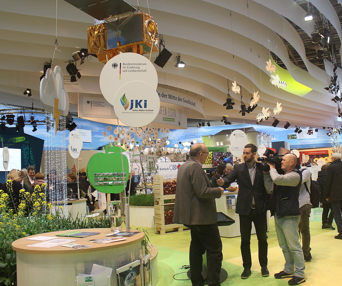 Dr. Sandra Krengel (Institut für Strategien und Folgenabschätzung) stellte ihr Forschungsprojekt zu Extremwetterereignissen vor. Dr. Henning Nordmeyer (Institut für Pflanzenschutz in Ackerbau und Grünland) demonstrierte die Bilderkennungssoftware mit der beim Drohnenüberflug Ackerunkräuter schon im Jungstadium identifiziert werden können. Dr. Holger Lilienthal (Institut für Pflanzenbau und Bodenkunde) erklärte, wie Fernerkundungsdaten den Landwirten zukünftig nutzen können. Aufmerksam geworden durch das Modell des Sentinel Erdbeobachtungssatelliten über dem JKI Beet mit der Gewitterwolke, interviewte ein Fernsehteam aus der Slowakei den Fernerkundungsexperten aus Braunschweig.