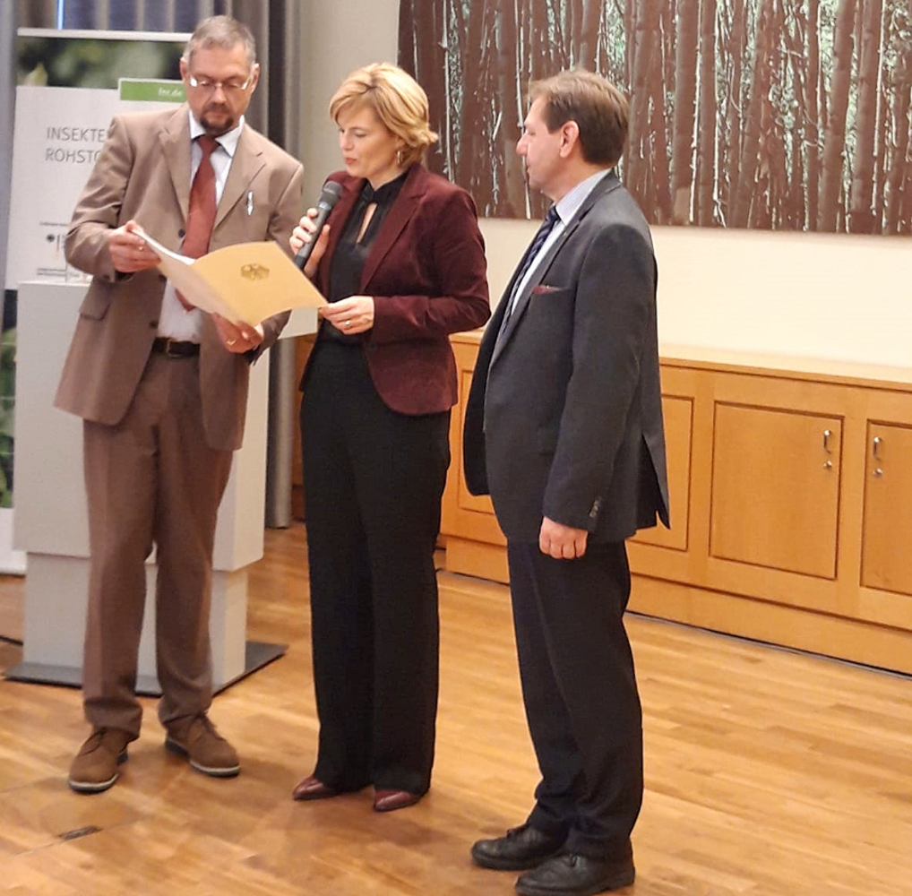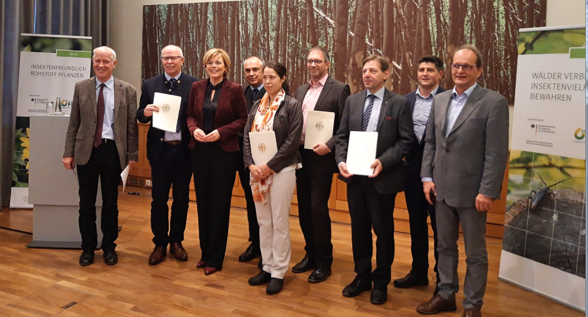 FInAL, dieses Kürzel steht für ein neues vom BMEL über den Träger FNR gefördertes Projekt, welches am 1.10.2018 gestartet ist. FInAL zielt auf die Förderung von Insekten in AgrarLandschaften durch integrierte Anbausysteme mit nachwachsenden Rohstoffen ab. Es ist als wissenschaftlich begleitetes Modell- und Demonstrationsvorhaben angelegt, in dem Maßnahmen in so genannten Landschaftslaboren erforscht werden. Im Projekt, das vom Thünen-Institut koordiniert wird, sind gleich fünf der 17 JKI-Fachinstitute involviert, namentlich die Institute für Bienenschutz, Biologischen Pflanzenschutz, für Pflanzenbau und Bodenkunde, für Strategien und Folgenabschätzung sowie die Berliner Kollegen von ÖPV. Außerdem mit im Boot sind das ZALF in Müncheberg und die Landwirtschaftskammer Niedersachsen. Vertreter aller vier großen Projektpartner (TI, JKI, ZALF, LWK Nds.) nahmen am 9.10. in Berlin die Förderbescheide aus den Händen von Landwirtschaftsministerin Julia Klöckner entgegen. Das gesamte Fördervolumen beläuft sich auf rund 5 Mio. Euro, auf das JKI entfallen davon 1,77 Mio, die Laufzeit beträgt drei Jahre.