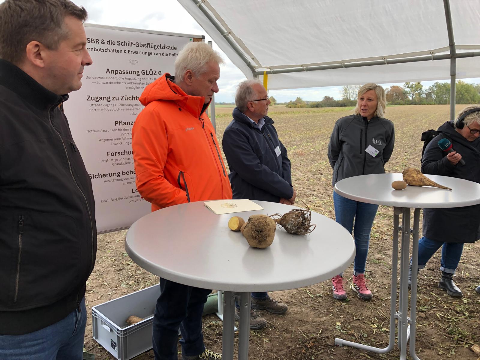 An dem Feldtermin nahmen Vertreterinnen und Vertreter aus Wirtschaft, Wissenschaft und Landwirtschaft teil, unter anderem Dr. Sabine Andert (Leiterin des JKI-Instituts für Pflanzenschutz in Ackerbau und Grünland in Braunschweig), Prof. Dr. Jürgen Gross (Leiter des JKI-Instituts für Pflanzenschutz in Obst und Weinbau in Dossenheim) sowie Forschende aus dem JKI und weiteren Einrichtungen. Auch Akteure der Zuckerrübenwirtschaft, der amtlichen Pflanzenschutzdienste und der Zuckerrübenanbauerverbände beteiligten sich am Austausch.