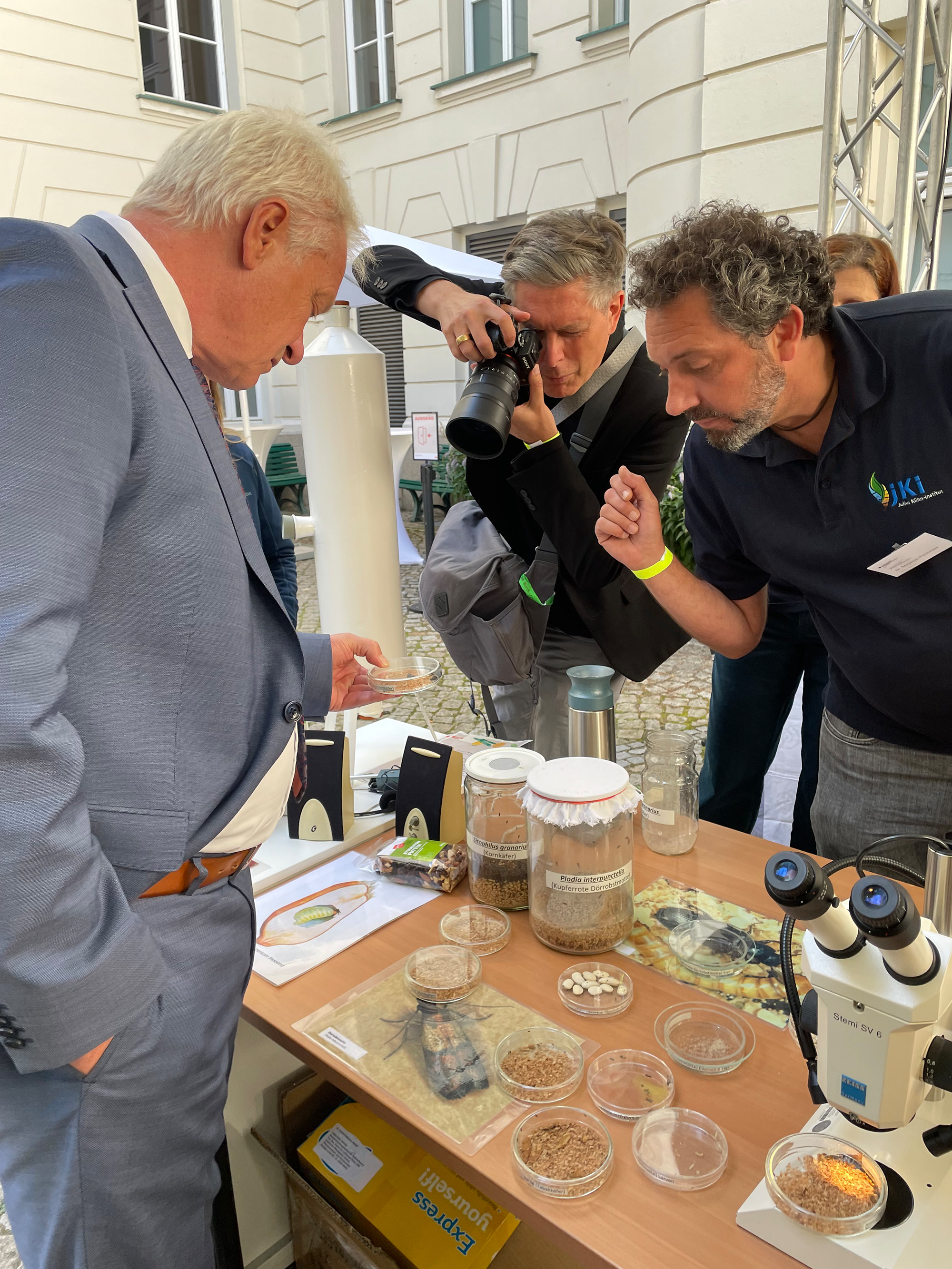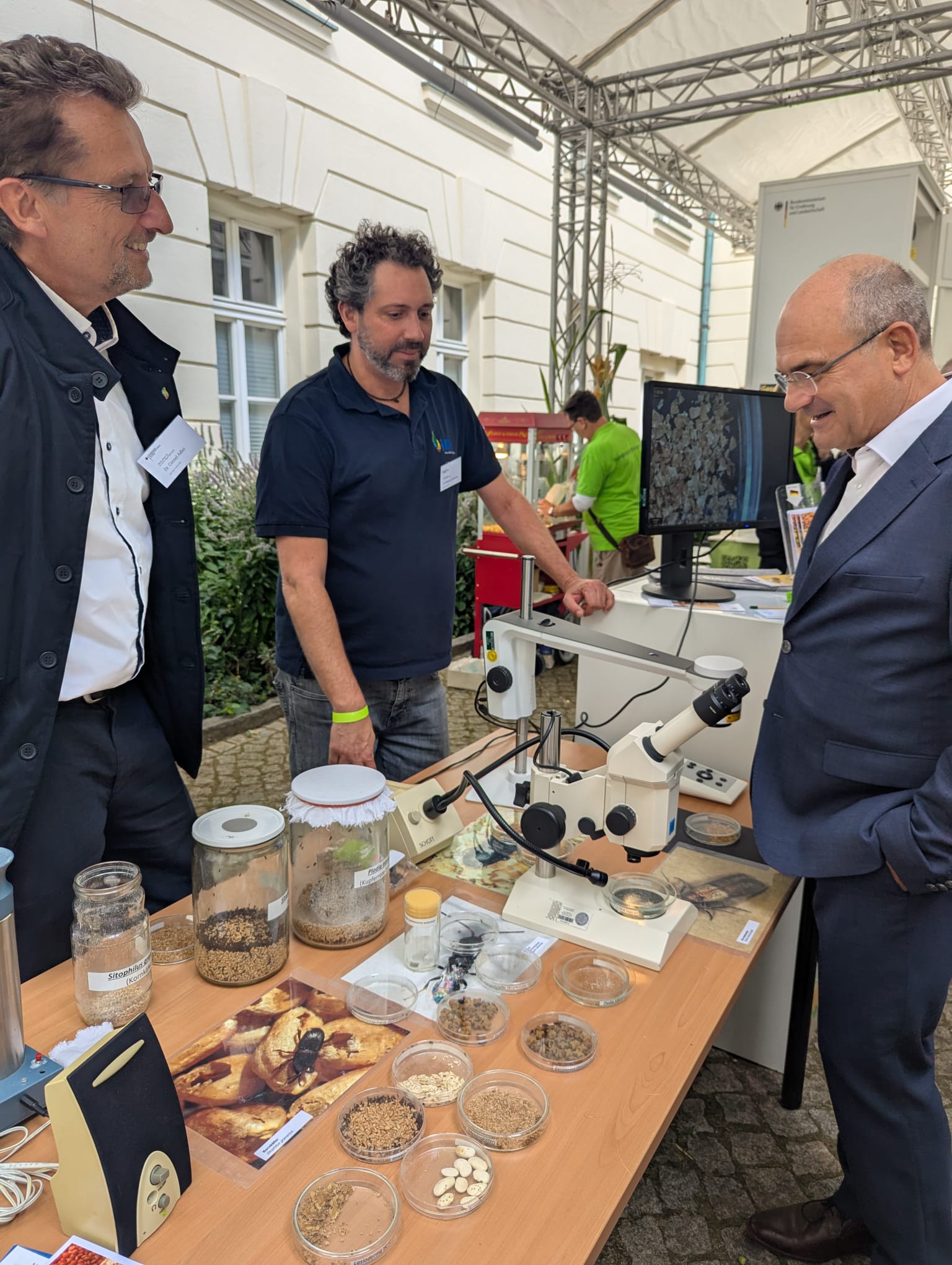 Rund 3.200 Besucherinnen und Besucher fanden ihren Weg in die zwei schön gestalteten Innenhöfe und weiteren Räumlichkeiten des Landwirtschaftsministeriums. Am Samstag besuchte Bundesminister Alois Rainer im Rahmen seines Rundgangs den Stand des JKI und ließ sich ausführlich zu den Zusammenhängen zwischen Schadinsekten, die Vorräte befallen und den Auswirkungen auf Transportketten und Landwirtschaft informieren. Dr. Christina Müller und Dr. Benjamin Fürstenau zeigten die Hörlanzen, die einen Kornkäferbefall frühzeitig erkennbar machen, sowie die Vorratsschädlinge in den verschiedenen Entwicklungsstadien. Auch Staatssekretär Prof. Dr. Dr. Markus Schick kam bei seinem Rundgang am Samstag in den Hörgenuss und mit Dr. Cornel Adler ins Gespräch, vor allem über den Zusammenhang zwischen Vorratsschutz, Klimawandel und Ernährungssicherung.
