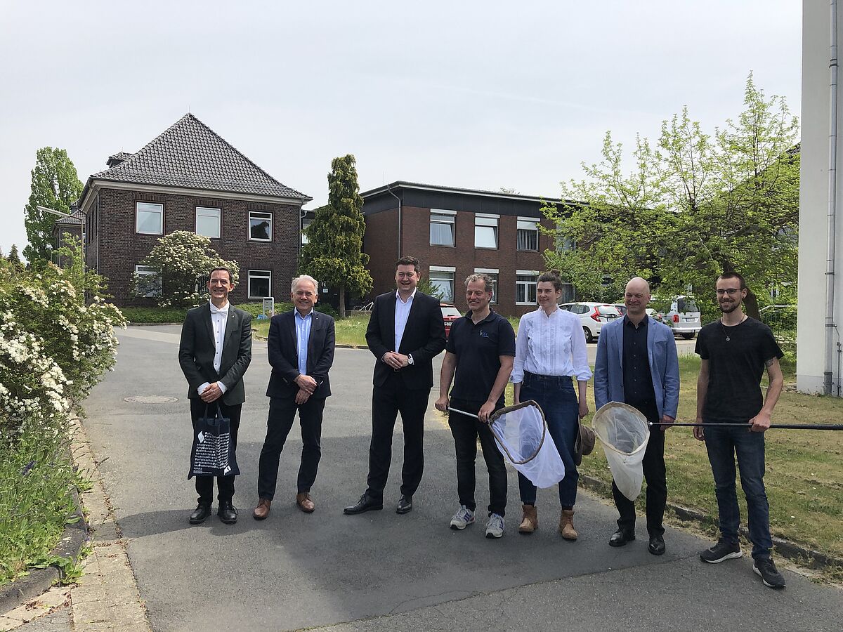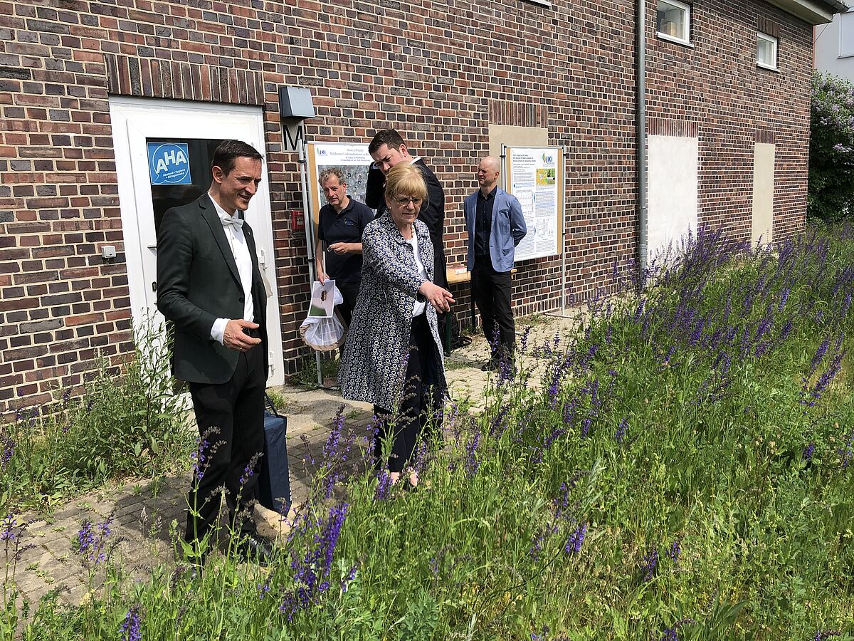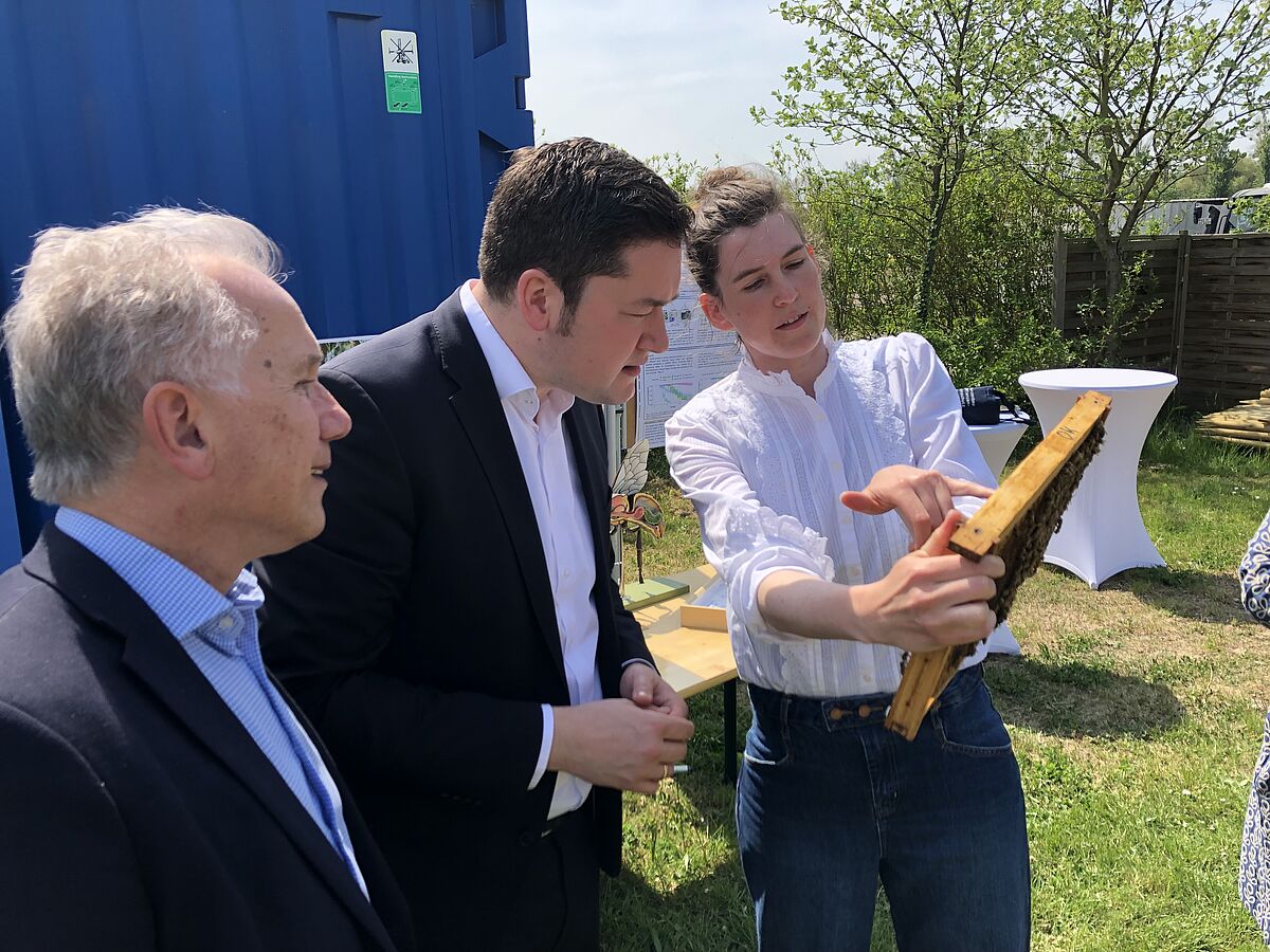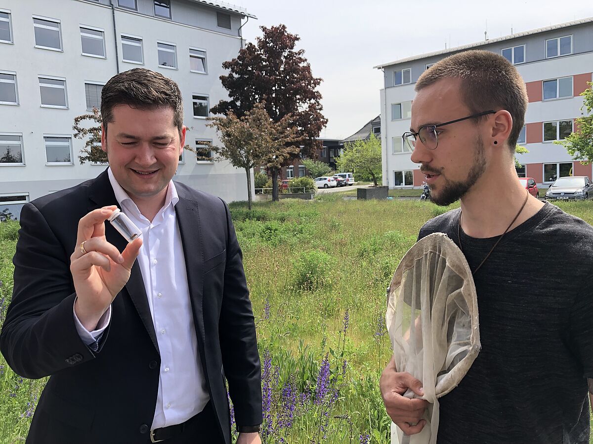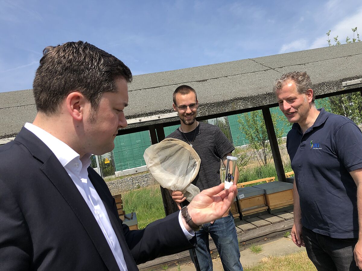 Dass Braunschweigs Forschungslandschaft noch mehr als das offensichtliche Thema „Automobilität“ zu bieten hat, davon konnten sich Kornblum und Hesse beim Rundgang über das Institutsgelände am Messeweg überzeugen. Auf der Wildblumenwiese beeindruckten nämlich unterschiedliche Wildbienenarten durch ihre Mobilität. Ganze sechs Arten, fast alles Roten Liste-Arten in Niedersachsen oder ganz Deutschlang, fingen die Kollegen vom Fachinstitut für Bienenschutz mit dem Kescher vor den Augen der VIP-Gäste ein. So konnten Institutsleiter Dr. Jens Pistorius und Henri Greil die Dichtpunktierte Goldfurchenbiene, eine Mai-Langhornbiene, eine Gefleckte Kuckuckshummel, eine Gewöhnliche Natternkopfbiene, eine Goldene Schneckenhausbiene und zuletzt noch ein Holzbienenweibchen lebend präsentieren.