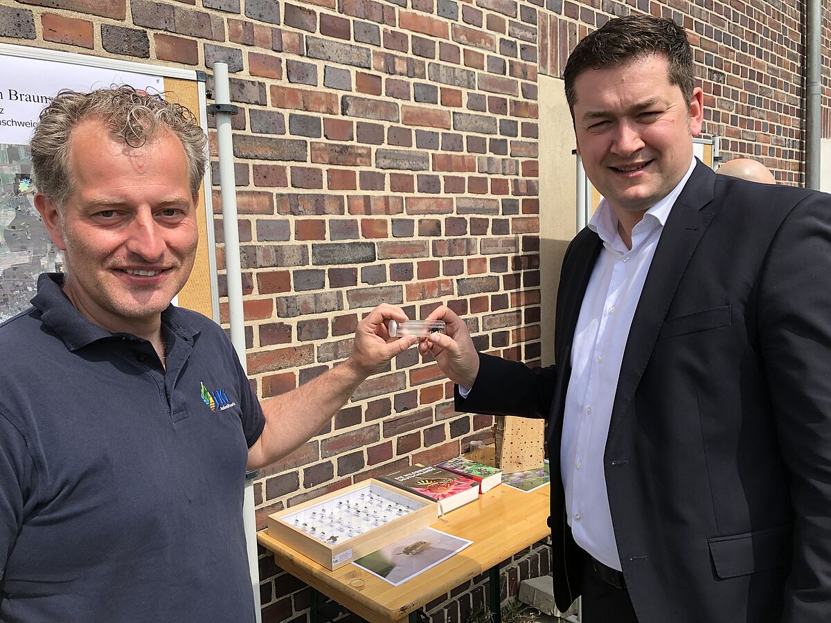 Beim Betrachten der vorübergehend im Glas gefangenen Bienenarten ließ sich perfekt überleiten auf gemeinsame Projekte mit der Stadt: Bei den Aktivitäten zur „Bienenstadt Braunschweig“ und in dem Forschungsprojekt „BeesUp“ geht es um die wildbienenfördernde Gestaltung städtischer Flächen unter Berücksichtigung ihrer unterschiedlichen Nutzung. In Kooperation mit der Stadt Braunschweig wurden bereits etwa 40 Hektar Stadtfläche auf mehr als 100 Einzelflächen Blühflächen, Staudenpflanzungen und Streuobstwiesen zur Förderung von Wildbienen angelegt. In dem Kooperationsvorhaben „BeesUp“ mit der TU Ilmenau und der Universität Halle-Wittenberg wird außerdem eine durch Künstliche Intelligenz unterstützte App entwickelt, die Laien hilft, Bienenarten zu bestimmen. Durch populationsgenetische Untersuchungen wird zudem die Vernetzung der Teilpopulationen innerhalb des Braunschweiger Stadtgebiets untersucht.