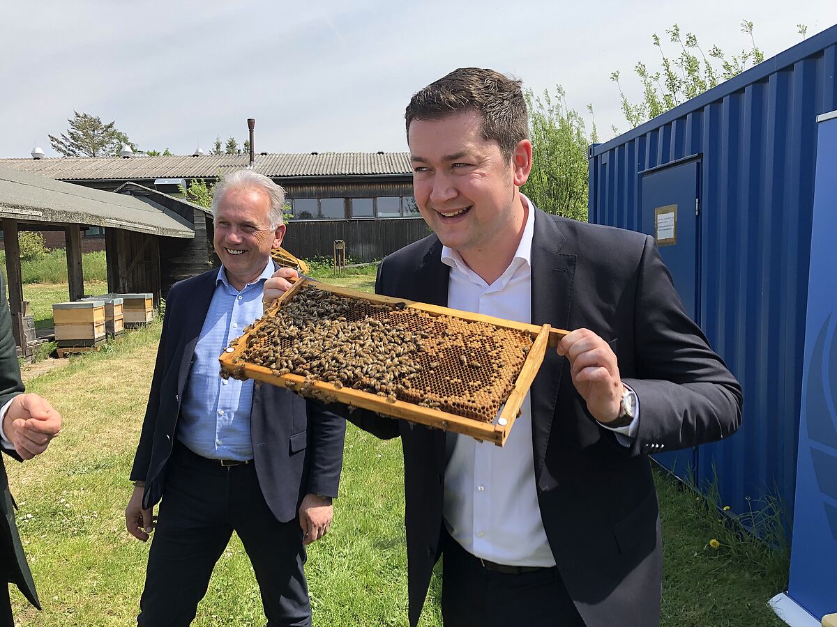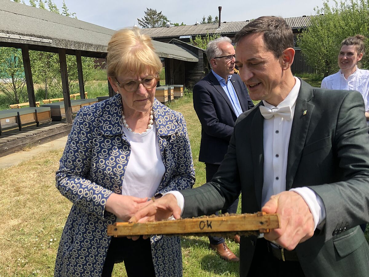 Ein Höhepunkt des Besuchs für Dr. Kornblum und Dr. Hesse war das Abschlussfoto, bei dem sie beide auf Tuchfühlung mit den Honigbienen gehen durften. Hier zeigte sich eindrücklich, wie hilfreich es war, dass im jahrhundertelangen Züchtungsprozess Honigbienen-Völker auch auf ihre „Sanftmut“ hin ausgelesen wurden.