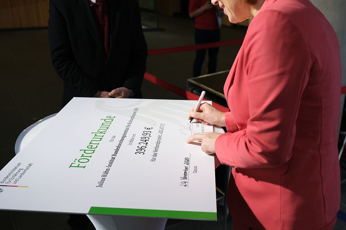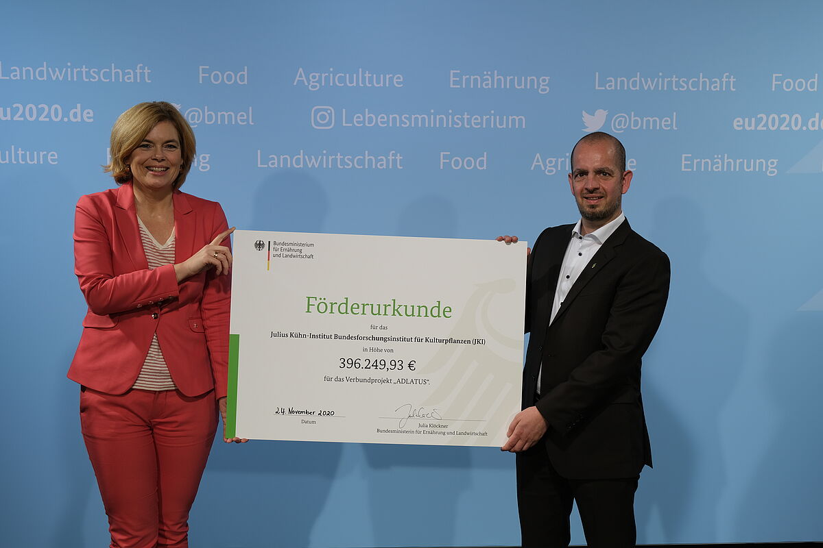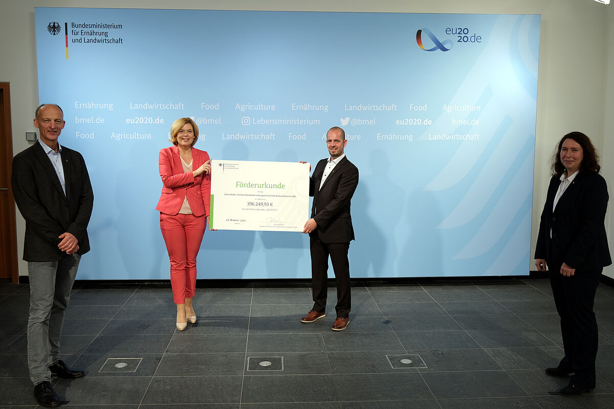 Bundeslandwirtschaftsministerin Julia Klöckner ließ es sich nicht nehmen, persönlich am 24.11.20 die Förderbescheide für ein groß angelegtes Verbundforschungsprojekt zur züchterischen Verbesserung der Kartoffel zu überreichen. Das Julius Kühn-Institut (JKI) ist einer der vier Partner. JKI-Fachinstitute in Quedlinburg (Institut für Resistenzzüchtung und Stresstoleranz, Institut für Züchtungsforschung an gartenbaulichen Kulturen) und Braunschweig (Institut für Epidemiologie und Pathogendiagnostik) haben dazu ihre Expertisen zu Krankheitserregern der wichtigen Kulturart gebündelt. Das BMEL fördert die Arbeiten am JKI mit knapp 396.250 Euro. Weitere Fördergelder fließen für die nächsten drei Jahre an die Böhm-Nordkartoffel Agrarproduktion GmbH & Co. OHG aus Ebstorf, die Westfälische Wilhelms-Universität in Münster sowie das Fraunhofer Institut für Molekularbiologie und angewandte Oekologie in Aachen.