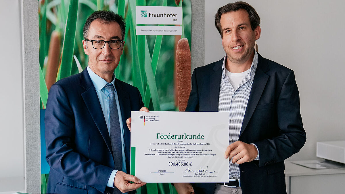 (Braunschweig/Stuttgart) In Niedersachen sollen künftig großflächig Rohrkolben angebaut werden. Die Landkreise Emsland und Cuxhaven wurden als Modellregionen für die Umsetzung eines vom Bundeslandwirtschaftsministerium (BMEL) mit insgesamt rund elf Millionen Euro geförderten Forschungsprojekts ausgewählt, weil sie „Hot Spots“ für Treibhausgasemissionen aus trockengelegten Moorböden sind. Das auf neun Jahre (2023-2032) angelegte Projekt „RoNNi“ (Nachhaltige Erzeugung und Verwertung von Rohrkolben auf Niedermoorstandorten in Niedersachsen) soll aufzeigen, wie sich für die Landwirtschaft entwässerte Niedermoorflächen klimaschonend nutzen lassen. Künftig werden dort auf Pilotflächen Rohrkolben angebaut. Dazu werden die Flächen wiedervernässt und so bewirtschaftet, dass der Moorboden erhalten bleibt. Die geernteten Rohrkolben (Typha angustifolia und Typha latifolia) sollen als Baustoff und zur Herstellung von Gartenbausubstrat genutzt werden. Am Freitag (27. Oktober) übergab Cem Özdemir, Bundesminister für Ernährung und Landwirtschaft, in Stuttgart den Förderbescheid über 390.000 Euro an das Julius Kühn-Institut, vertreten durch Dr. Lorenz Kottmann vom JKI-Institut für Pflanzenbau und Bodenkunde in Braunschweig.