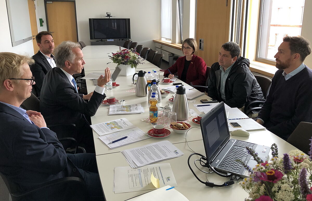 In the afternoon of July 15th a delegation of three agricultural specialists of the US-Department of Agriculture (USDA) visited the JKI in Quedlinburg. On behalf of USDA’s International Production Assessment Division IPAD, located in Washington D.C., Bryan Purcell travels the north-eastern German federal states in order to learn about yield development in grain and rapeseed. IPAD’s task lies in assessing global crop conditions and world agricultural production, providing crop production maps based on recent data. Purcell was accompanied by Sabine Lieberz and Leif Erik Rehder, both senior agricultural specialists with the U.S. embassy in Berlin. The guests met with JKI President Professor Frank Ordon, JKI’s research coordinator Dr. Florian Bittner and Dr. Til Feike, who is working at the JKI-institute for Strategies and Technology Assessment. Dr. Feike presented his works on climate change impact assessment in wheat. Since the JKI is also well grounded in plant protection and breeding research the following long and lively discussion covered issues like the limited availability of pesticides, resistance management and alternative pest control, rise and fall of certain pests in rapeseed, cereals and sugarbeets, breeding new resistant varieties, the German program to enhance acreage of pulses (lupins, faba-beans) and the necessity to widen crop rotation.