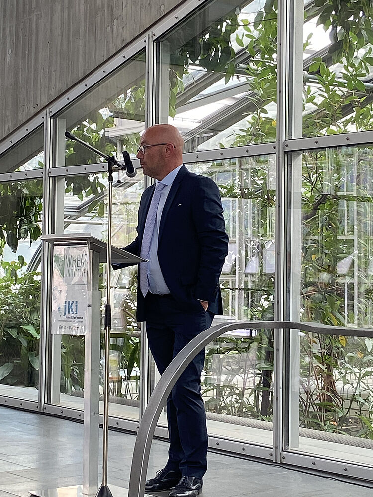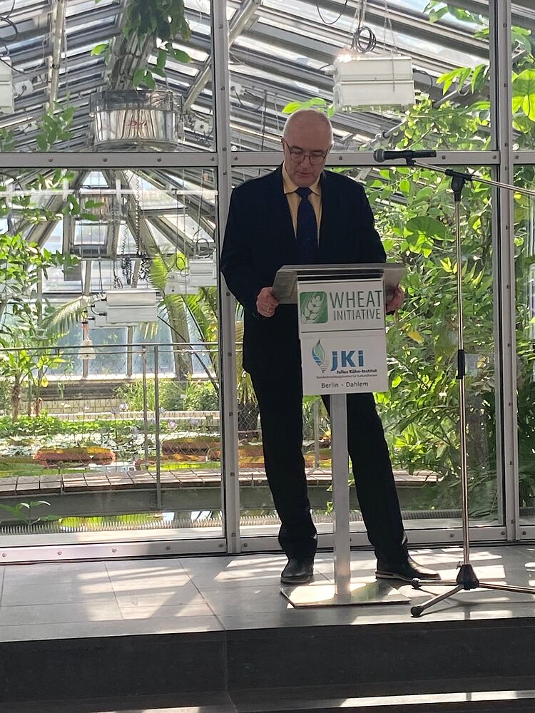 The four speakers Mr. Burkhard Schmied (Head of Department 7, BMEL), Mr. Frank Ordon (President of the Julius Kühn Institute), Mr. Peter Langridge (Head of the Wheat Initiative) and Mr. John Spink (Chair of the Institutional Coordination Committee) and Dr. John Spink (Head of the institutions) der Wheat Initiative highlighted the importance of wheat research to secure global food security. The launch of the SRA was completed with wine and food at the terrace of the greenhouse, where the invited guest from politic, research and industry took the opportunity to dicuss about the presented document.
