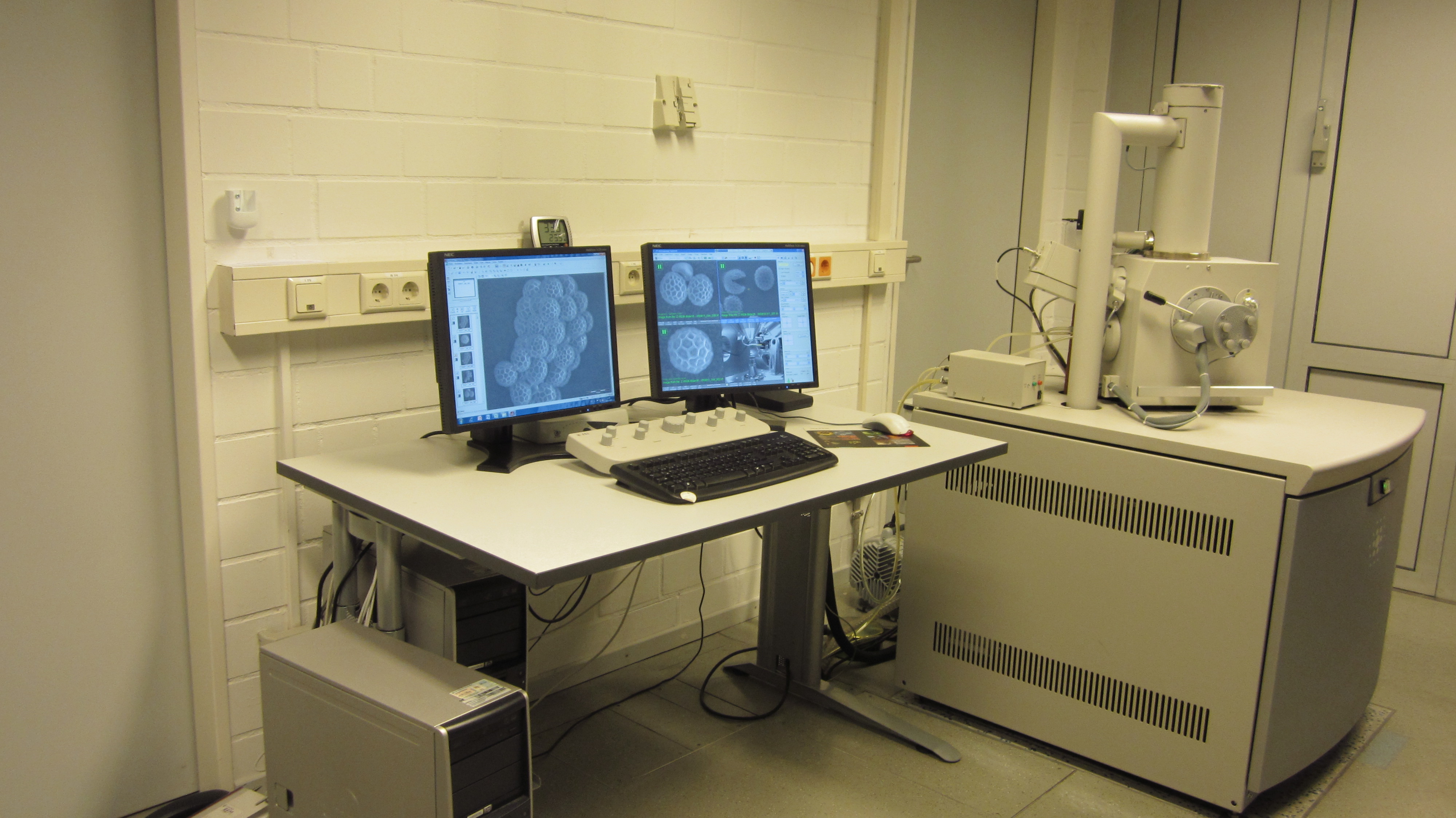 Beschreibung: Rasterelektronenmikroskop, 30 kV, Wolfram Kathode. Version: Quanta 250 (Seriennr. D9226), Es stehen drei Modi zur Verfügung: 1) Analyse trockener und fixierter Proben im Hochvakuum; 2) direkte Analyse von biologischen Proben im Niedrigvakuum, 3) Environmental Scanning Electron Microscope (ESEM) Modus für nicht vakuumstabile oder ausgasende Proben (z. B. Untersuchung von biologischen Proben ohne vorherige Fixierung).