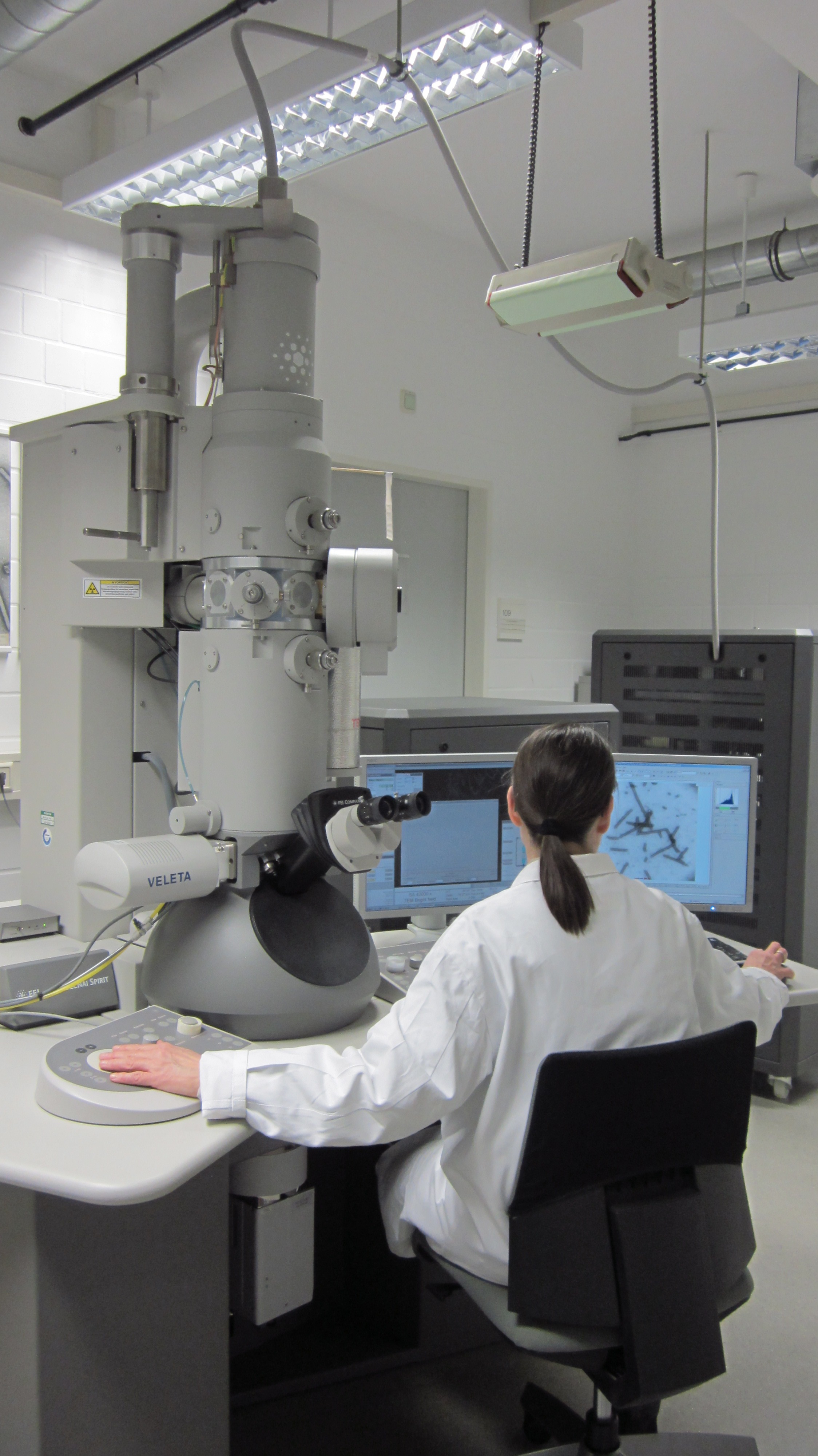 Beschreibung: Transmissionselektronenmikroskop, 120 kV, Wolfram Kathode, mit einer analogen und zwei digitalen Kameras (2K Veleta seitlich und 4K Eagle unterhalb angebracht) zur Dokumentation. Probenanalyse bei 80 kV für optimalen Kontrast bei biologischen Objekten. Version: Tecnai G2 Spirit (Seriennr. D1285), FEI Deutschland GMBH.