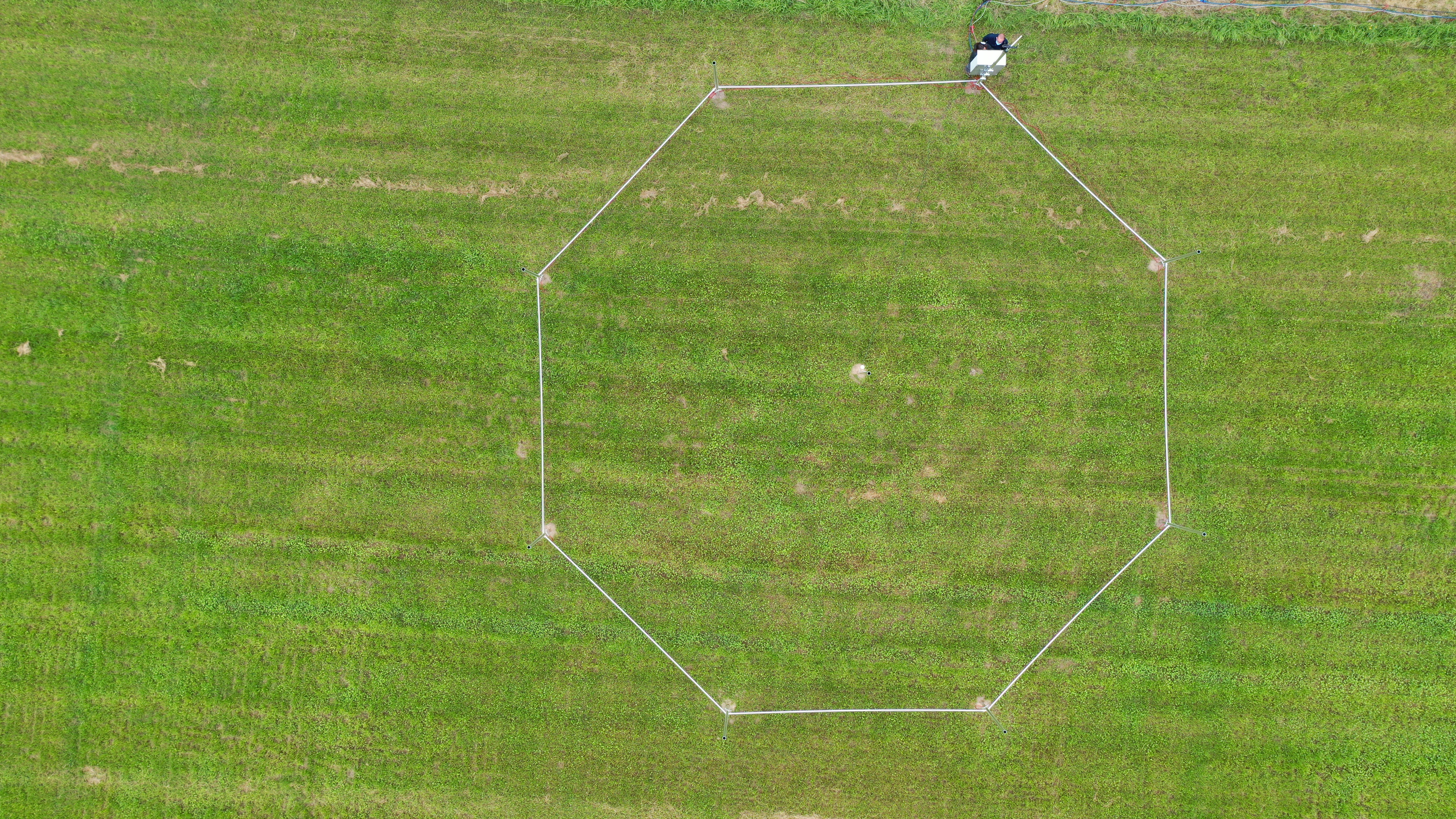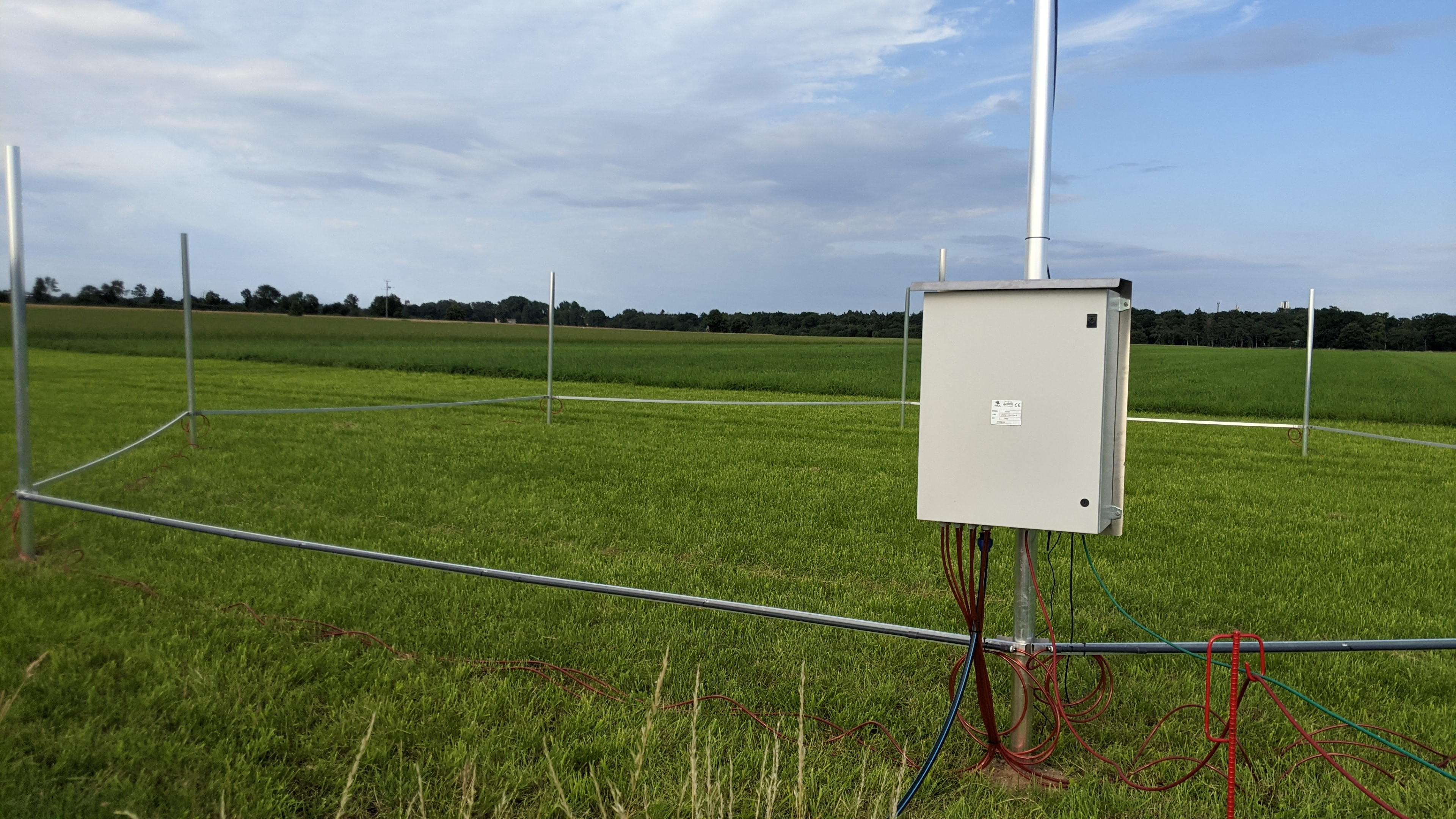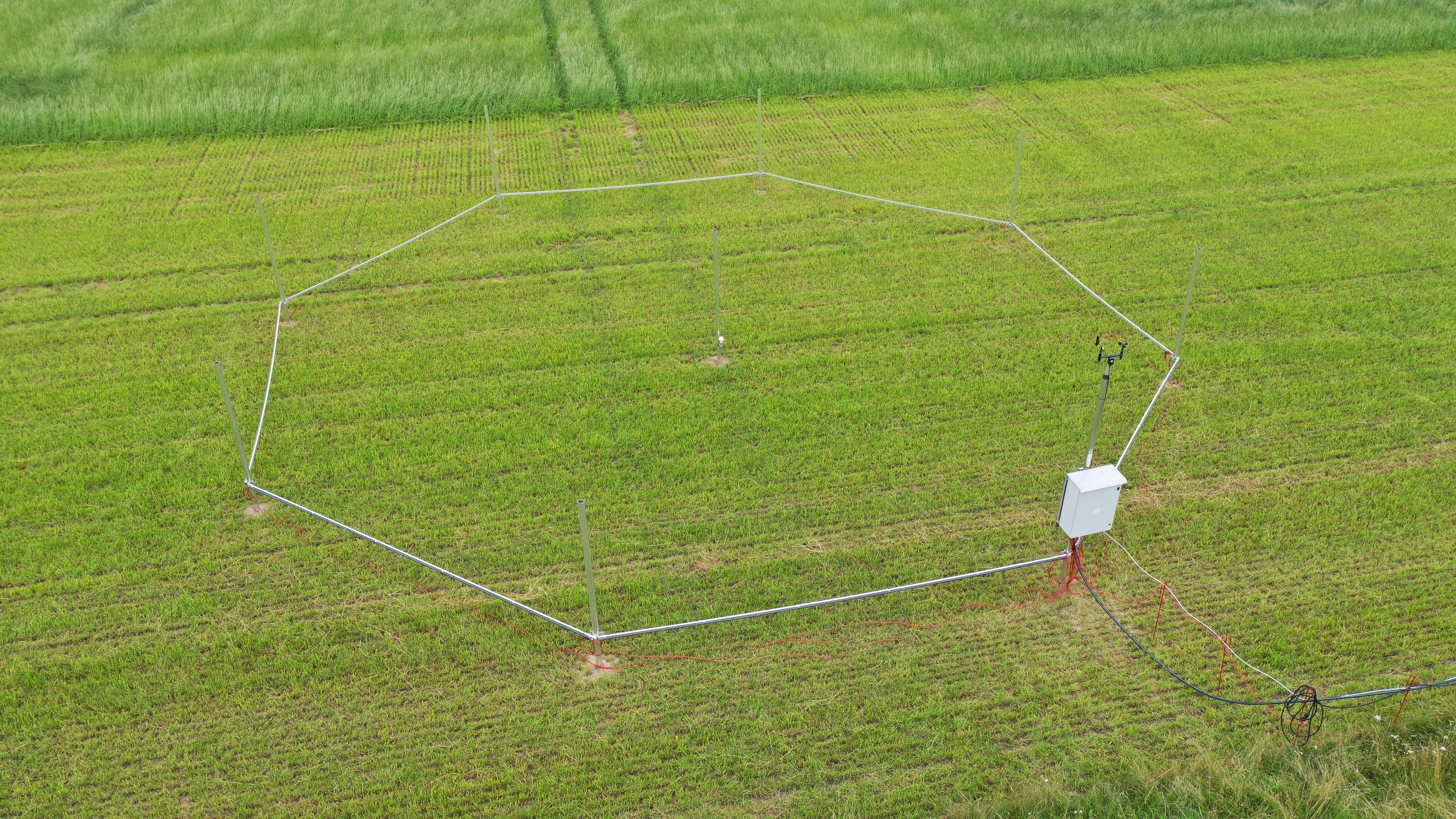 Beschreibung: Die FACE (free air carbon dioxide enrichment)-Anlage des JKI am Standort Braunschweig-Bundesallee besteht aus insgesamt vier Ringen (bzw. Oktagonen) mit Durchmessern von 17,5 Metern. Innerhalb der Ringe wird die Kohlenstoffdioxid (CO2)-Konzentration durch das Einleiten von CO2 durch außen verlaufende Röhren erhöht. Je nach Windrichtung- und Geschwindigkeit wird CO2 aus einer anderen Richtung eingeleitet. In der Mitte jedes Ringes befindet sich ein CO2-Analysator, die benötigte CO2-Menge wird je nach Zielkonzentration, Windrichtung und Windgeschwindigkeit über eine Steuereinheit geregelt. Jeder Ring wird dabei separat angesteuert, die vier Ringe sind daher auch unabhängig voneinander nutzbar.