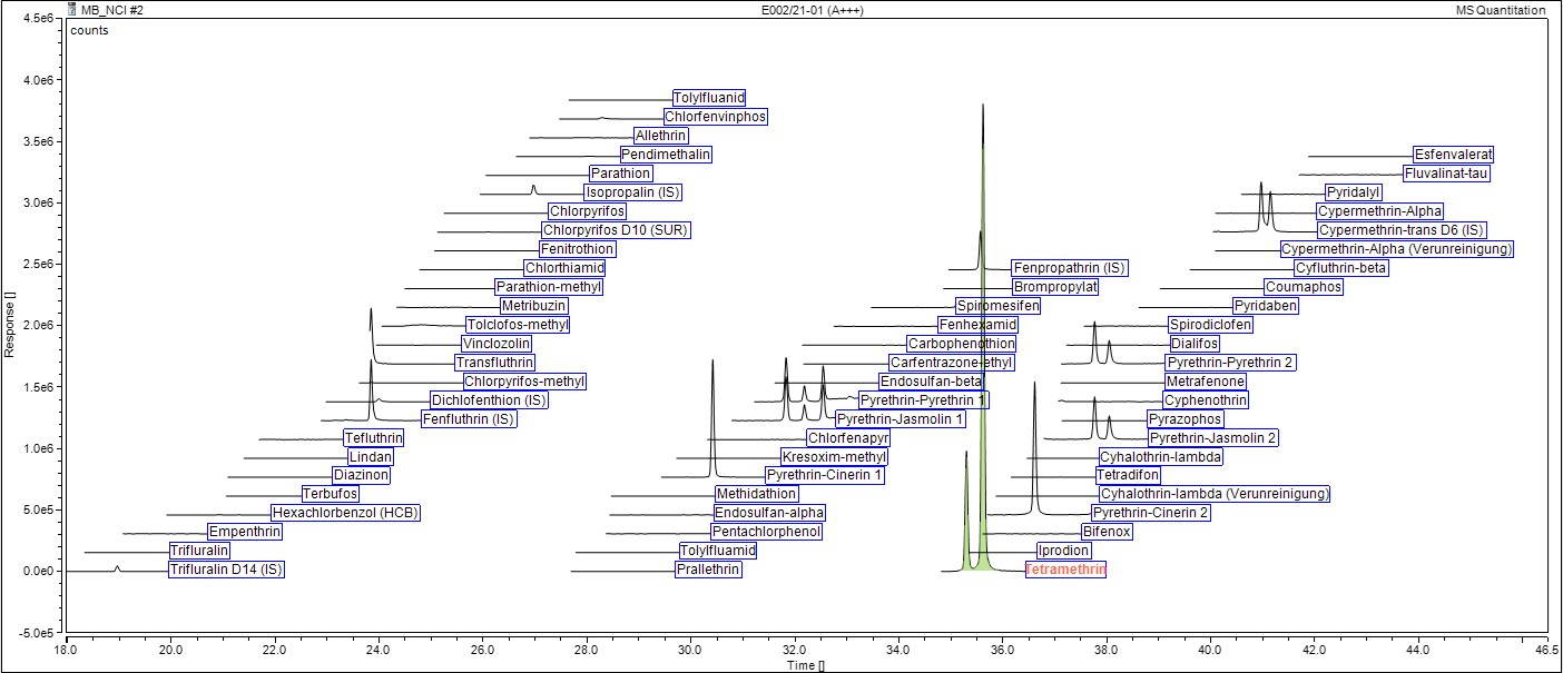 The GC-MS measuring system is used to identify and quantify the residues of pesticides and other relevant xenobiotics in various matrices [e.g. bees, plants, pollen, nectar, wax].