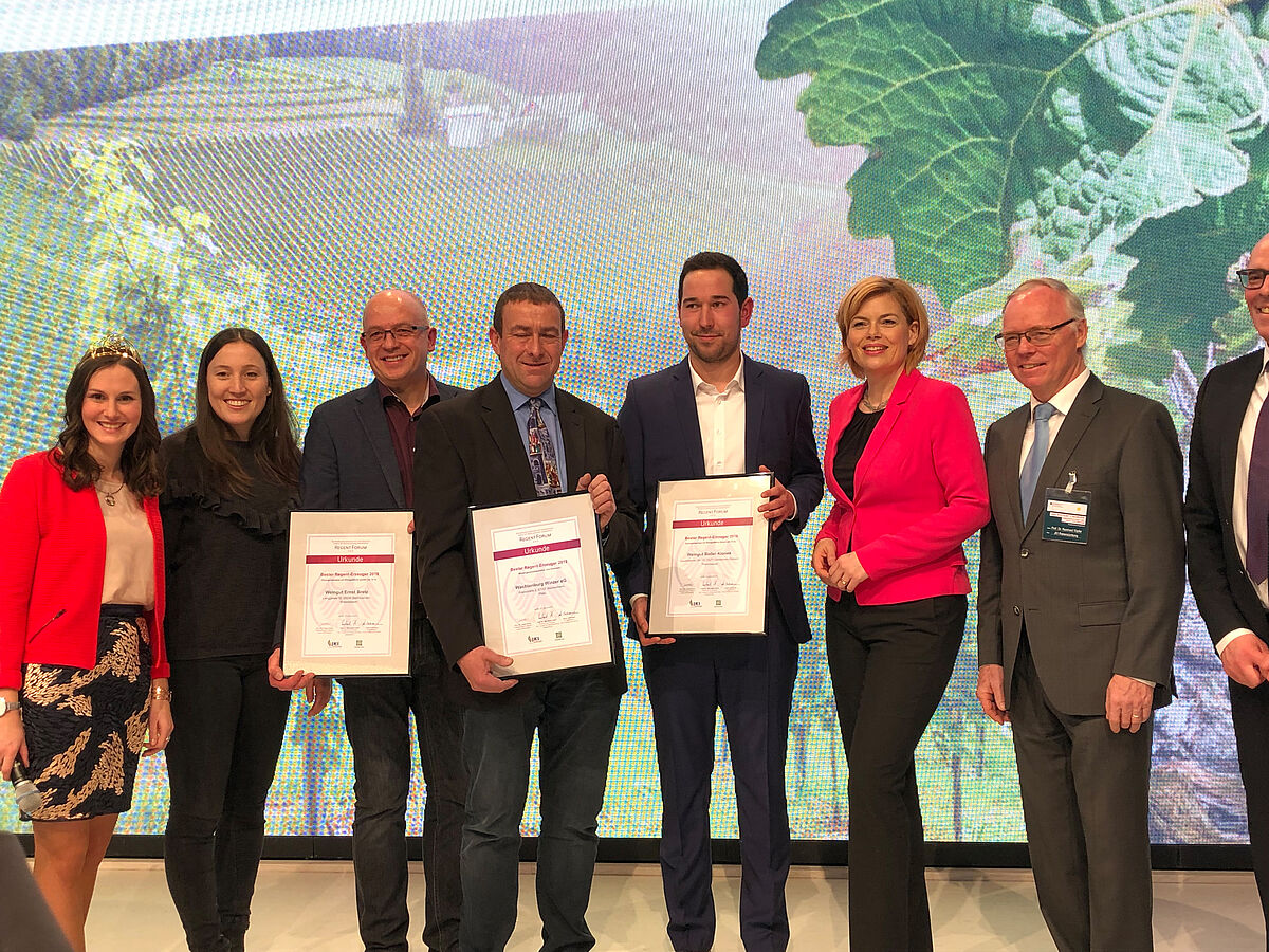 Auf der Internationalen Grünen Woche hat Bundesministerin für Ernährung und Landwirtschaft, Julia Klöckner, drei rheinland-pfälzische Weingüter mit dem Ehrenpreis ihres Ministeriums „Bester Regentwein-Erzeuger 2018“ ausgezeichnet. Preisträger sind das Weingut Boller-Klonek, das Weingut Bretz sowie die Wachtenburger Winzergenossenschaft.