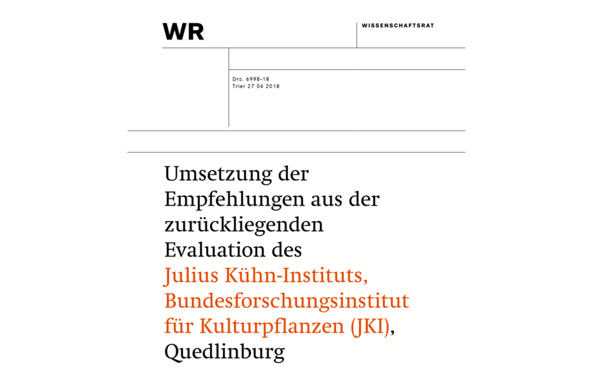 Wissenschaftsrat Umsetzung der Empfehlungen aus der zurückliegenden Evaluation des Julius Kühn-Institut, Bundesforschungsinstitut für Kulturpflanzen (JKI), Quedlinburg (Drs. 6998-18), Trier 27.4.2018 https://www.wissenschaftsrat.de/download/archiv/6998-18.pdf