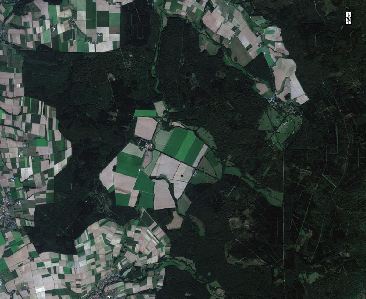 Domäne in Beberbeck (Hessen), Aufnahme vom 12.9.16 in Originalauflösung, Ausschnitt deckt eine Fläche von ca. 10 + 8 km ab. Quelle: Sentinel-2-Satellit/ESA (European Space Agency)