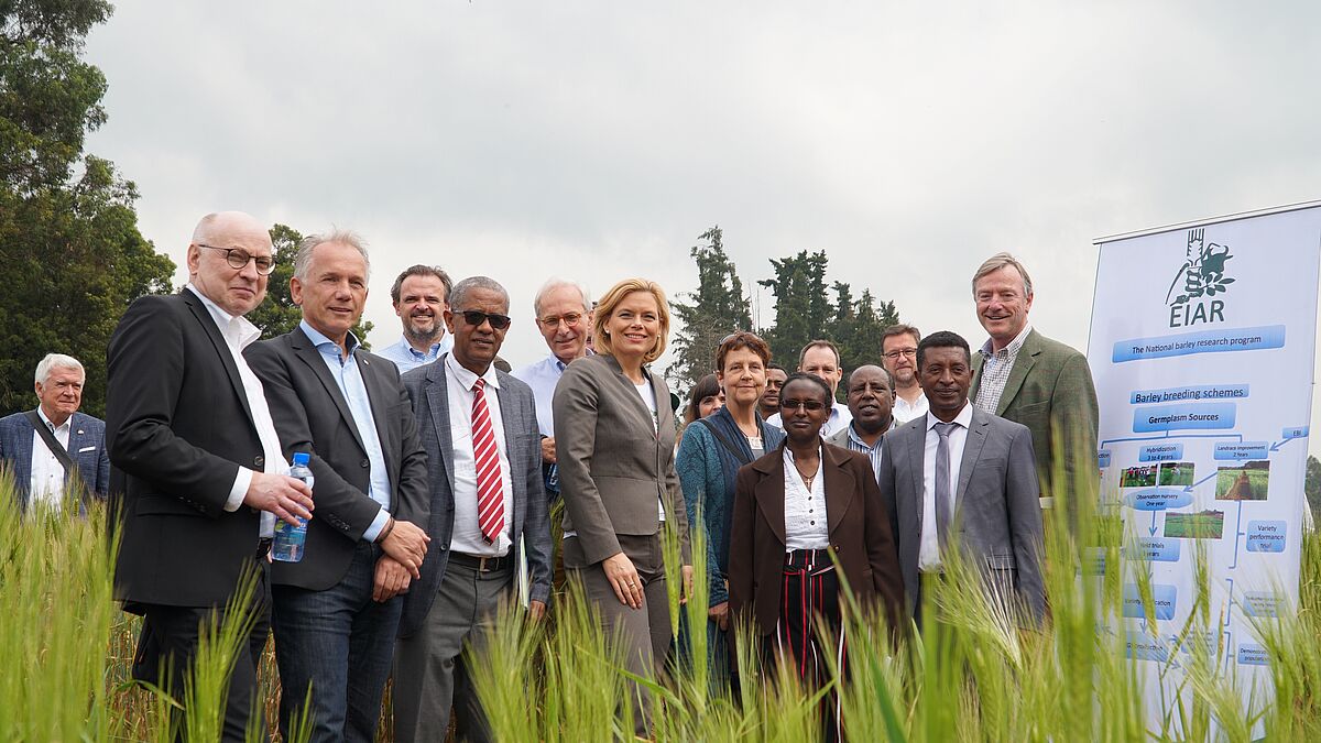 Auf Ihrer Reise nach Äthiopien vom 9. bis 11. Oktober 2019 wurde Bundeslandwirtschaftsministerin Julia Klöckner unter anderem von JKI-Präsident Prof. Frank Ordon begleitet. Teil des Programms war der Besuch der deutschen Delegation bei einem Kooperationsprojekt des JKI-Fachinstituts für Resistenzforschung und Stresstoleranz in Quedlinburg mit dem Ethiopian Institute of Agricultural Research (EIAR) in Holeta. Im Rahmen des vom BMEL finanzierten Projekts „Genomweite Assoziationsstudien zur Verbesserung der Trockenstresstoleranz in äthiopischen Gerste- (Hordeum vulgare) und Durumweizen-Herkünften“ sind zwei äthiopische Doktoranden am JKI in Quedlinburg beschäftigt und werden dort durch Prof. Ordon betreut. Ziel des Projektes ist es, Genomregionen bzw. Gene in Gerste und Hartweizen ausfindig zu machen, die an der Trockenstressreaktion der Pflanze beteiligt sind. Es geht darum neue Sorten zu züchten, die toleranter gegenüber diesen Klimabedingungen sind.