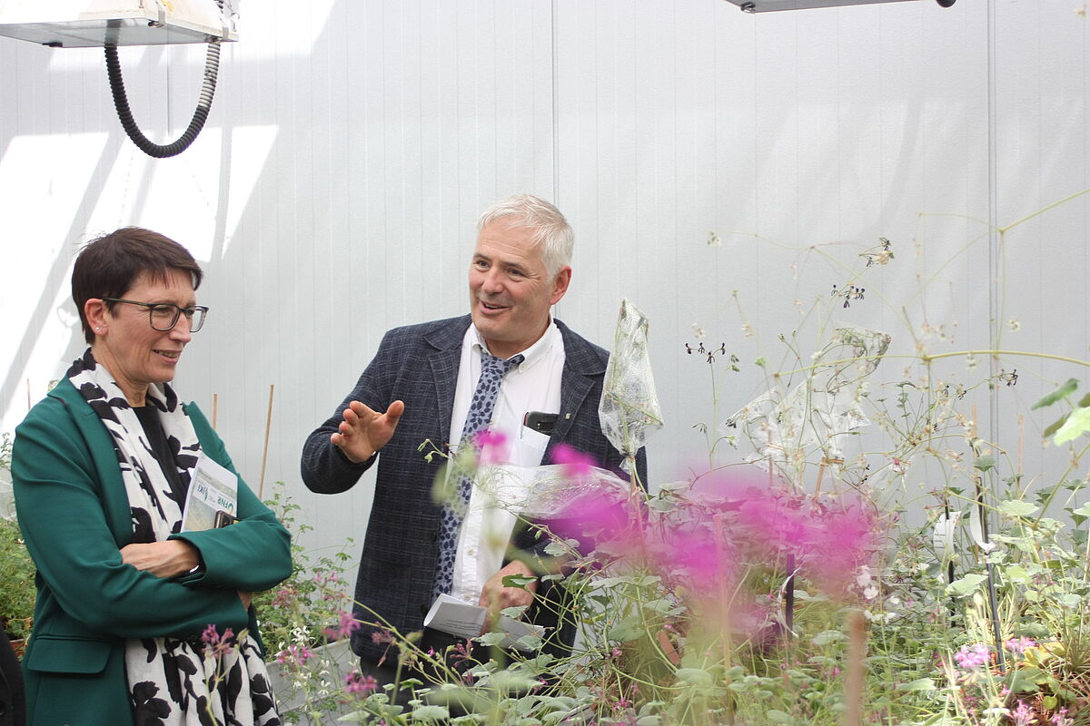 Solche persönlichen Besuche bieten jedoch auch die Gelegenheit, die Arbeit der JKI-Forschenden aus erster Hand kennenzulernen. Beim Rundgang durch Gewächshäuser und Labore informierte sich die Agrarwissenschaftlerin beispielsweise über die Arbeiten des Instituts für Züchtungsforschung an gartenbaulichen Kulturen am Beispiel des Johanniskrauts zur züchterischen Verbesserung von Arzneipflanzen sowie zur Erhöhung der Virusresistenz des Saison-Gemüses Spargel.