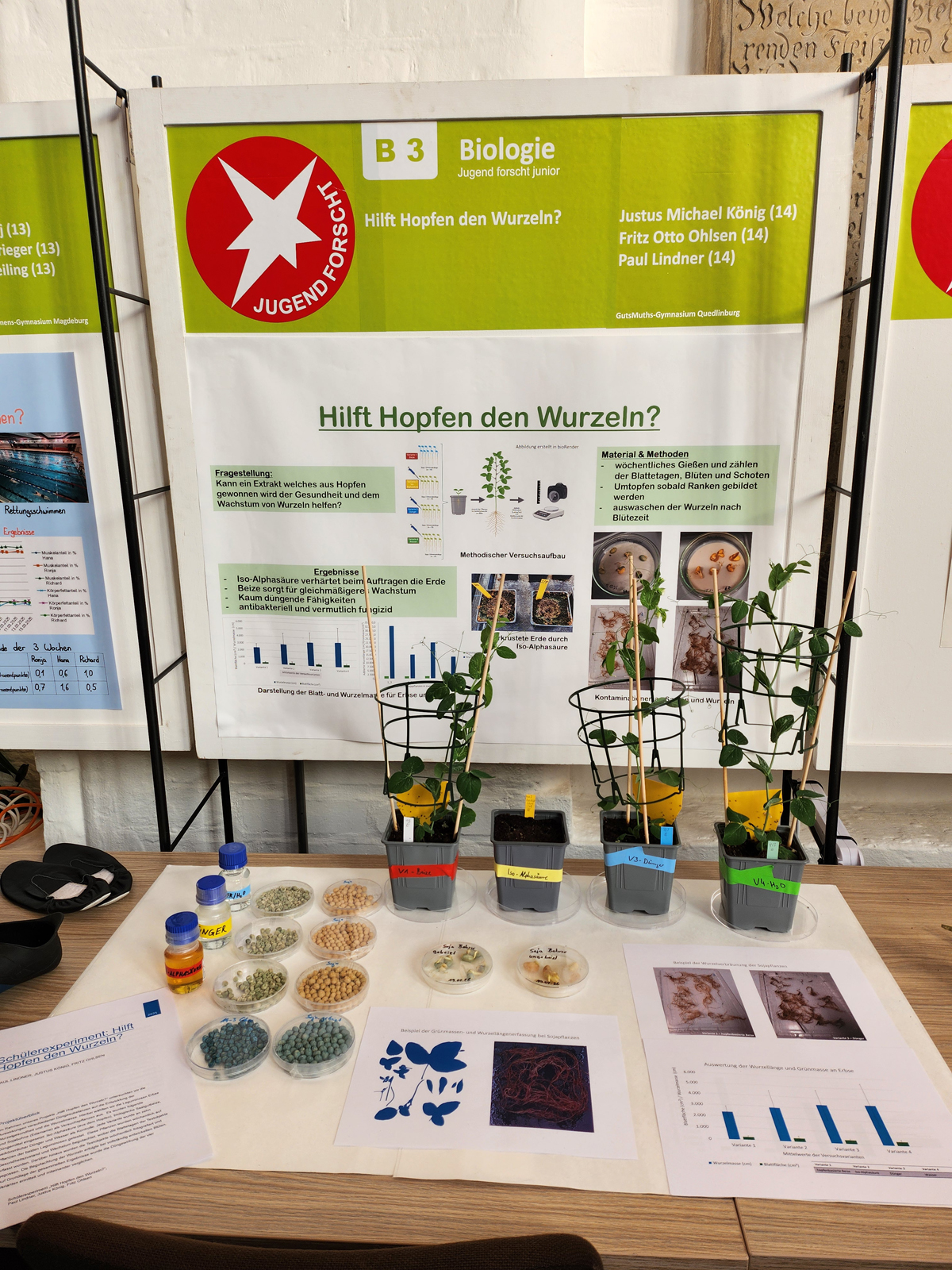 Von Oktober bis Ende Januar hat die Gruppe zum Thema „Hilft Hopfen den Wurzeln?“ am JKI in Quedlinburg geforscht. Dabei untersuchten sie die Auswirkungen verschiedener Düngesubstanzen auf die Entwicklung der Wurzelgesundheit und der Wurzelmasse. Als Versuchspflanzen wählten sie die zwei Leguminosen Erbse und Sojabohne (Edamame) aus. Das Jugend forscht – Projekt „Hilft Hopfen den Wurzeln?“ wurde betreut durch Dr. Janine König (JKI-ZG) und Bastian Daum (GutsMuths Gymnasium Quedlinburg).