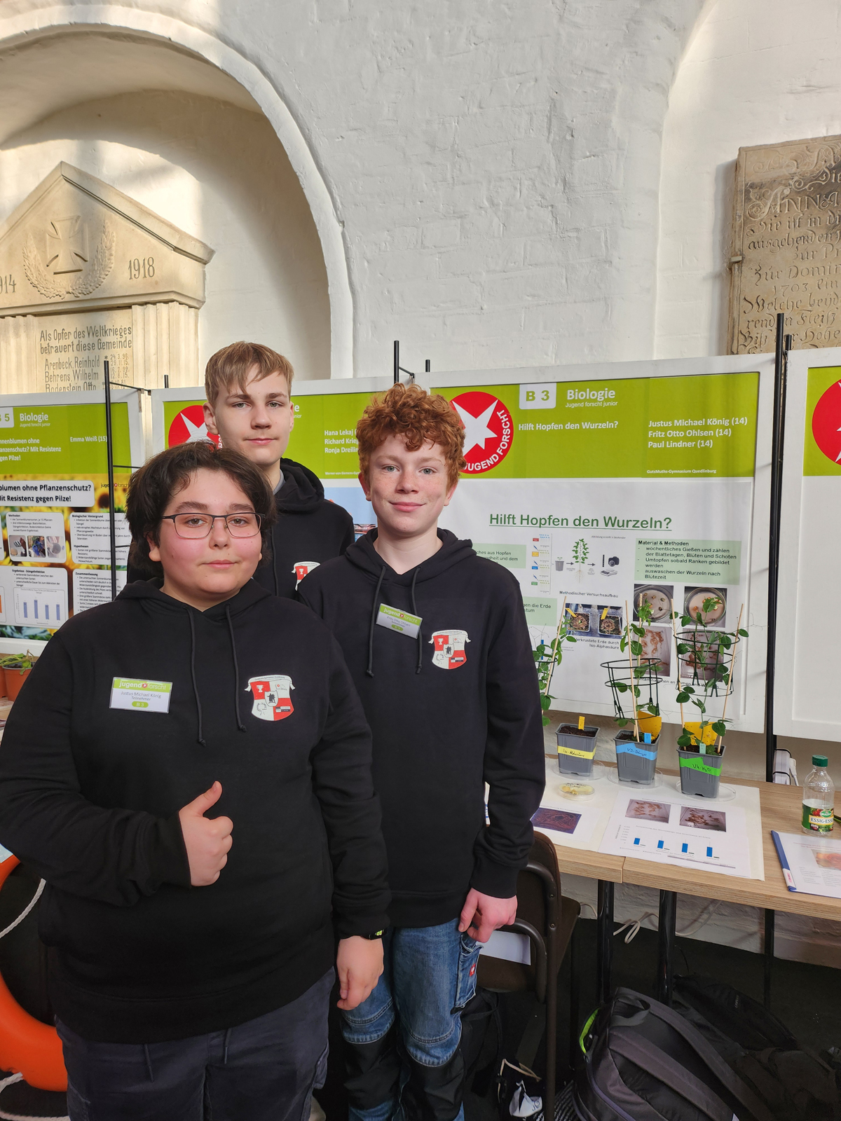 Am 26.02.2026 fand der Regionalwettbewerb Jugend forscht junior in Stendal statt. Dr. Janine König (JKI-Institut für Züchtungsforschung an gartenbaulichen Kulturen) war dort mit einer Schülergruppe der 8. Klasse des GutsMuths Gymnasiums Quedlinburg vertreten. Die drei Schüler Paul Lindner, Justus König und Fritz Ohlsen haben am JKI das Thema „Hilft Hopfen den Wurzeln?“ an Erbsen und Sojabohnen untersucht.