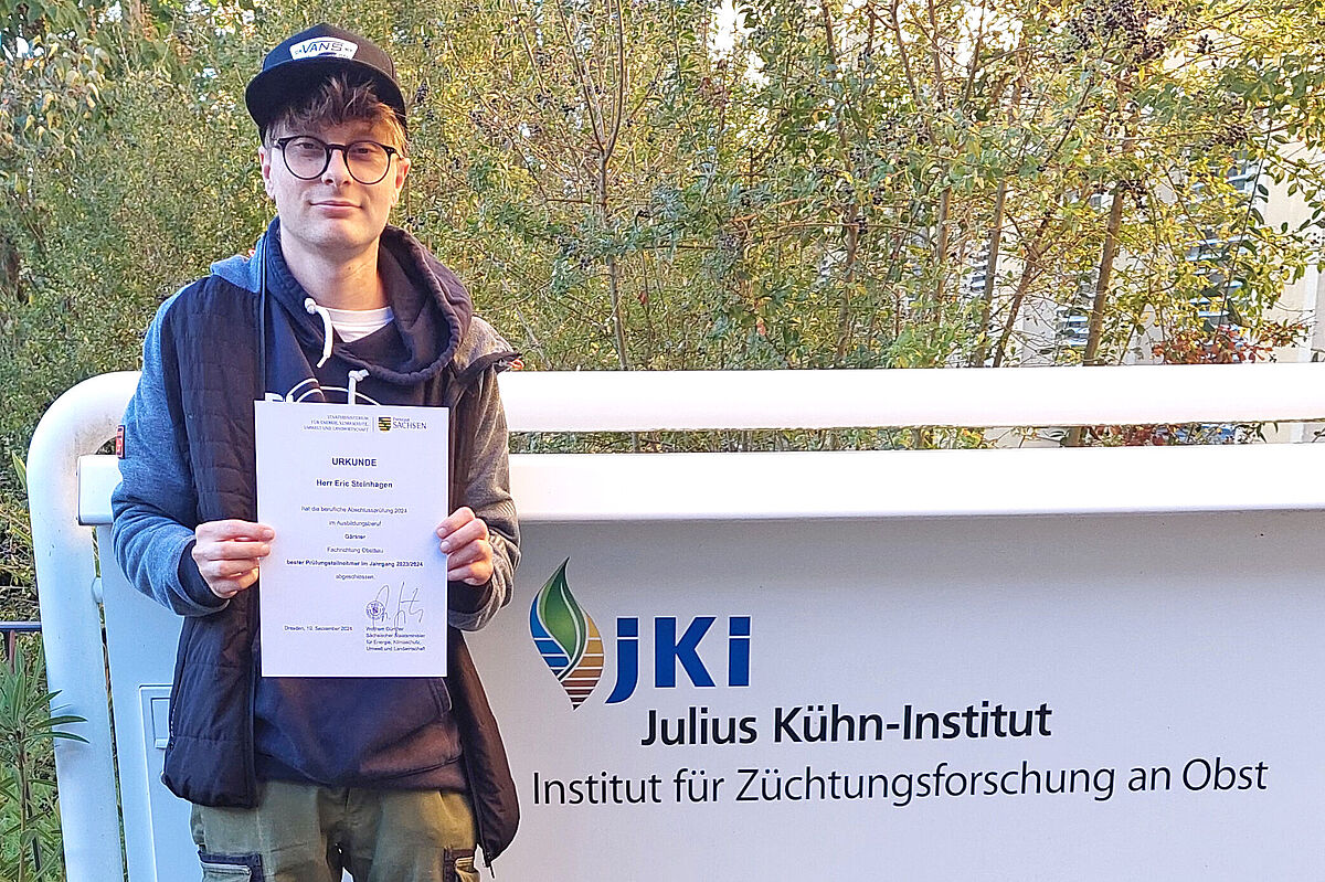 (Dresden-Pillnitz) Das JKI-Institut für Züchtungsforschung an Obst in Dresden-Pillnitz bildet seit vielen Jahren Biolaboranten/-innen sowie Gärtner/-innen in der Fachrichtung Obstbau aus. Einer von ihnen ist Eric Steinhagen. Seit 2020 absolvierte er seine berufliche Ausbildung im Pillnitzer Institut. Betreut wurde er dabei von seinem Ausbildungsleiter Thomas Stier sowie den an der Ausbildung beteiligten Kollegen Herrn Uwe Schroller und Sebastian Herbst. In diesem Jahr wurde die Ausbildung erfolgreich abgeschlossen.