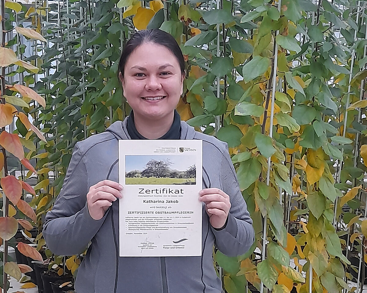 (Dresden-Pillnitz) Katharina Jakob hat erfolgreich ihre Prüfung in einen Zertifizierungskurs zur Obstbaumpflege absolviert. Dieser Kurs wird seit 2024 erstmals von der Akademie der Sächsischen Landesstiftung Natur und Umwelt (LaNU) in Kooperation mit Partnereinrichtungen in Sachsen angeboten. Das JKI-Institut für Züchtungsforschung an Obst in Dresden-Pillnitz ist Partner in diesem Kurs und ist verantwortlich für das Modul: „Obstzüchtung und Wildobst“. Kürzlich haben die Teilnehmerinnen und Teilnehmer dieses ersten Kurses ihre schriftlichen und praktischen Prüfungen abgelegt. Eine der Teilnehmerinnen war Frau Katharina Jakob. Mit ihrem Abschluss ist Frau Jakob nun für zwei Jahre berechtigt in den nächsten zwei Jahren den Titel einer zertifizierten Obstbaumpflegerin zu tragen. Mit diesem Zertifikat darf sie nun Fördermittel für die Jung- und Altbaumpflege im Rahmen der Förderrichtlinie Natürliches Erbe des Freistaates Sachsen beantragen. Darüber hinaus ist sie mit ihrem Wissen Ansprechpartnerin des Institutes bei Anfragen an das JKI sowie bei zahlreichen Veranstaltungen, wie dem Pillnitzer „Apfeltag“.