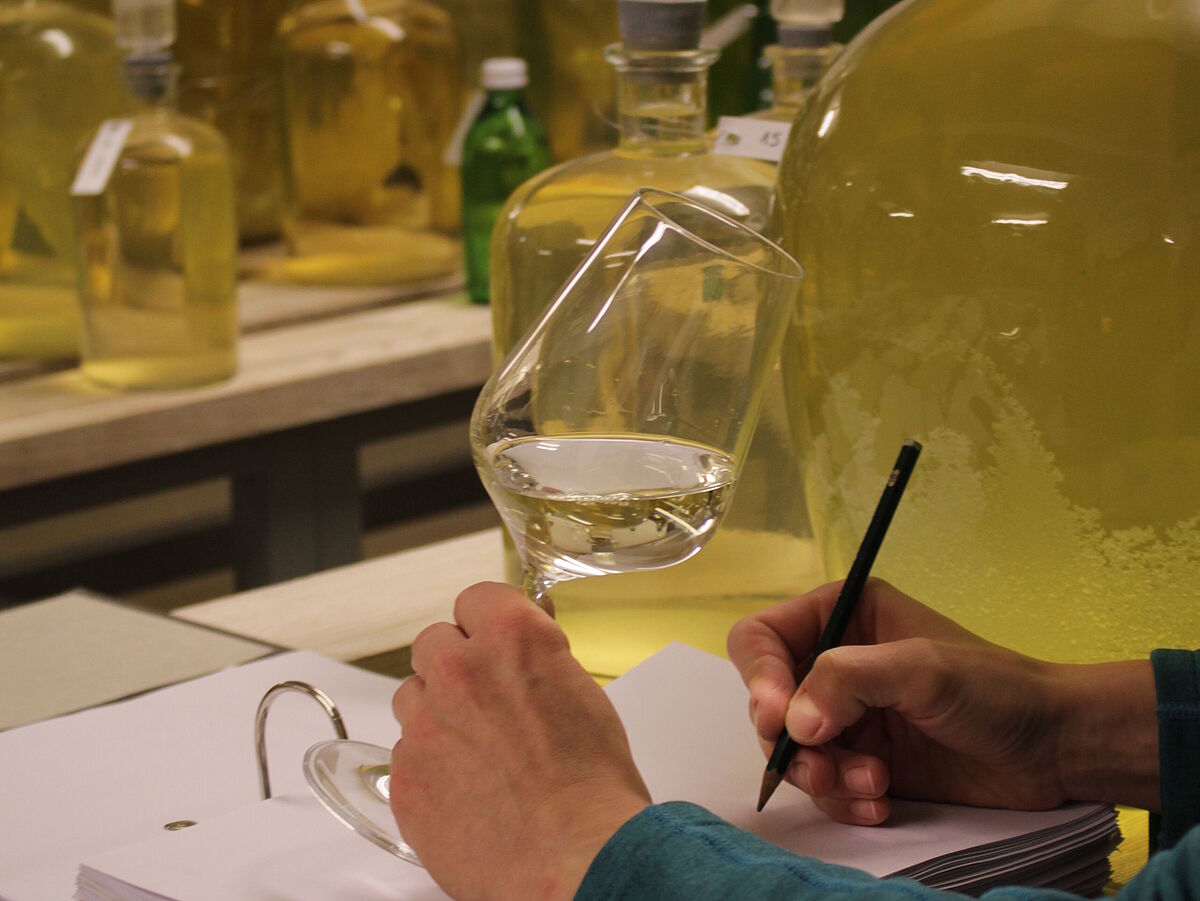 Hunderte von Weinen von 0,5 bis 100 Litern warten im Versuchsweinkeller Siebeldingen darauf, verkostet zu werden. Hört sich nach einem Traumjob an? „Nicht immer“, erklärt Anna Kicherer. „Denn nur ein kleiner Prozentsatz an Weine schafft es tatsächlich als neue Rebsorte auf den Markt zu kommen. Neben Resistenzen, weinbaulicher Eignung und Ertrag muss nämlich vor allem der Wein geschmacklich überzeugen! Man stellt sich den Job schon sehr traumhaft vor – täglich Weine verkosten und das in der Arbeitszeit – aber nicht alle Weine sind gut. Je nach Fragestellung und Projekt sind auch Weine dabei, die nicht so lecker schmecken…“